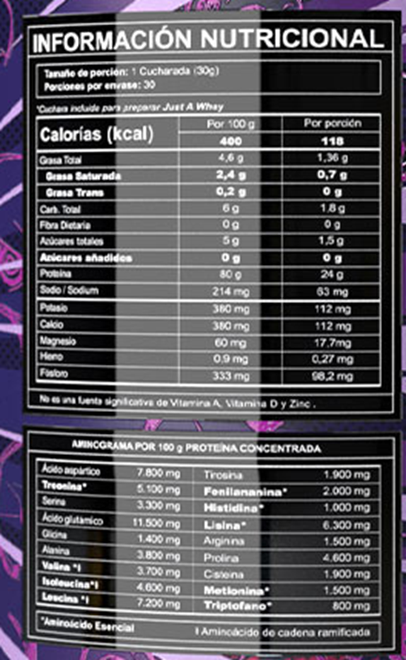 JUST A WHEY no es solo una proteína, es un manifiesto en polvo. Cada servicio te brinda 24g de Proteína Whey Concentrada (WPC80), pero la verdadera revolución está en los detalles: enzimas digestivas que maximizan cada gramo, asegurando que tu cuerpo reciba lo que necesita, sin desperdicios.